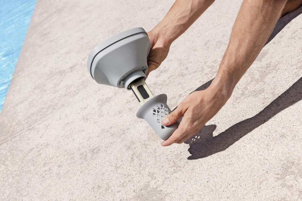 Het apparaat werkt volledig drijvend, zonder dat er gereedschap nodig is, en is geschikt voor zwembaden en bubbelbaden tot 1.400 liter, inclusief alle Lay-Z-Spa modellen. Het ingebouwde oplaadbare batterijpakket biedt 8 uur werktijd en wordt volledig opgeladen in 5-6 uur. Voor grotere baden wordt aangeraden om de drijver elke drie dagen 8 uur te laten draaien voor optimaal resultaat.