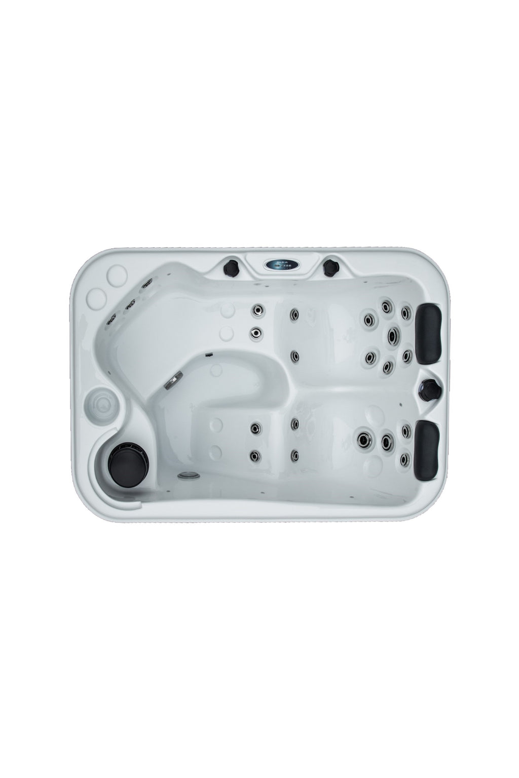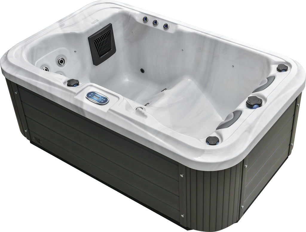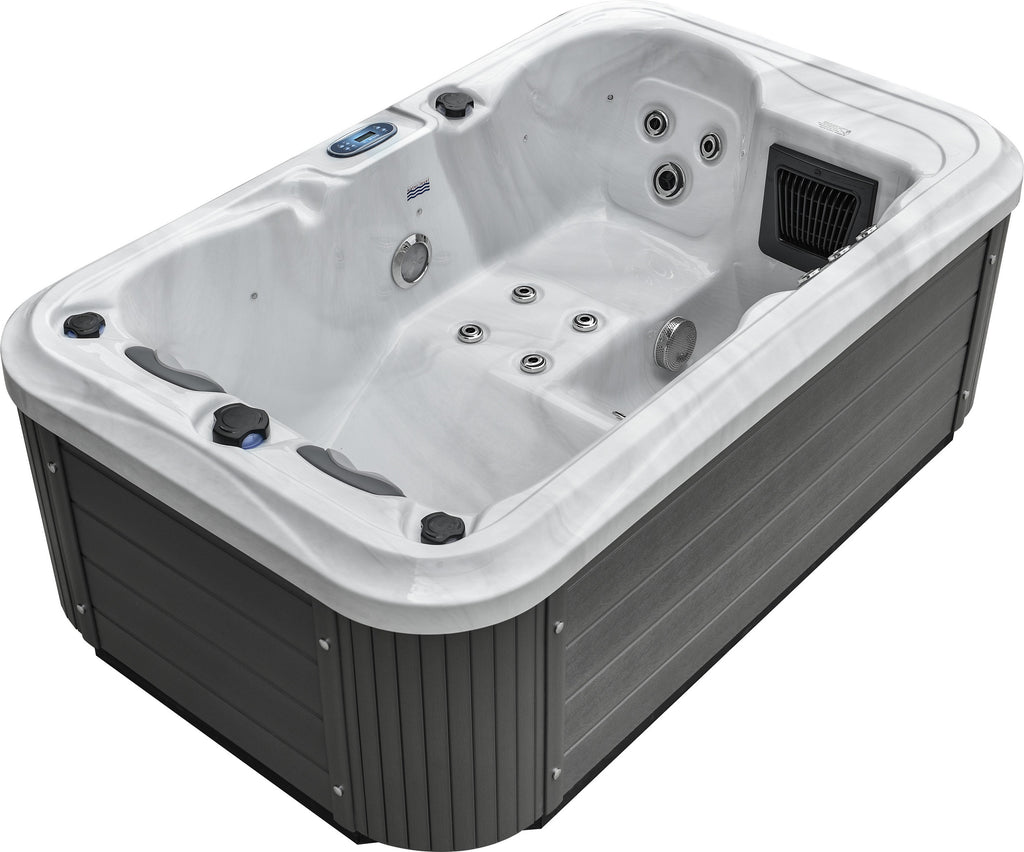 De spa heeft een stevig RVS frame, een stijlvolle grijs polystyreen buitenkant en een luxe marmer witte acryl kuip. Met 1 vaste zitplaats en 2 ligplaatsen is comfort gegarandeerd. De heater van 2kW, voorzien van een 5 meter kabel en aardlekschakelaar, zorgt voor warm en aangenaam water.