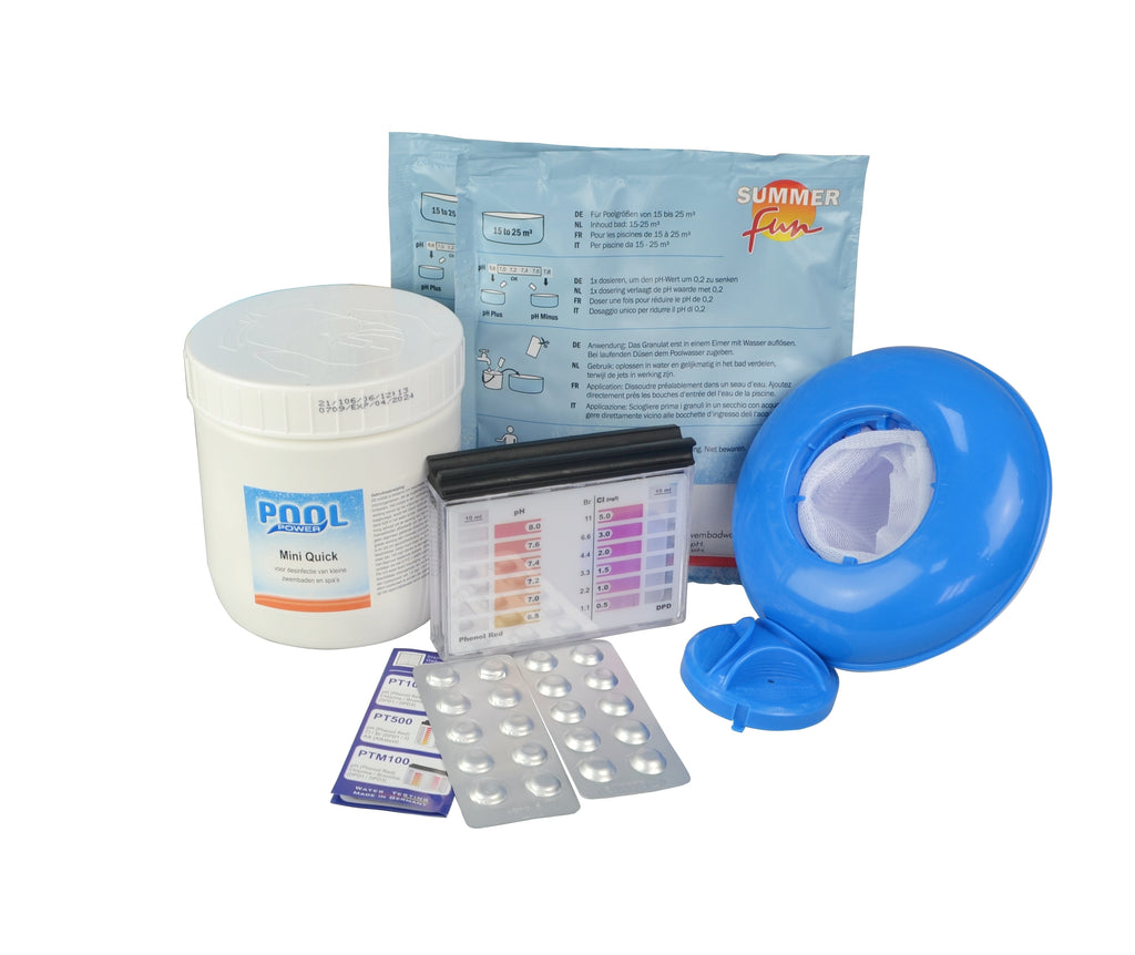 Met de testset meet je eenvoudig de chloor- en pH-waarde. Mini Quick chloortabletten verwijderen bacteriën, terwijl pH Min de pH-waarde verlaagt wanneer deze te hoog wordt. De bijgeleverde chloordrijver laat chloortabletten veilig oplossen zonder dat ze de liner beschadigen.